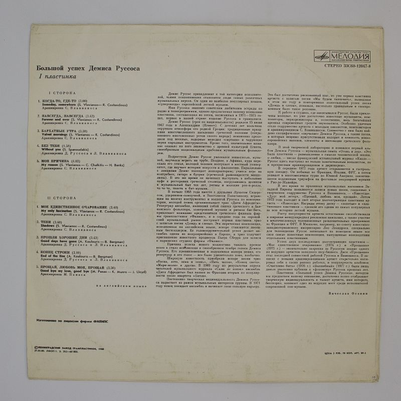 Не упустите возможность создать идеальный вечер с музыкой Демиса Руссоса. Погрузитесь в тёплый аналоговый звук винила и насладитесь каждым мгновением. Добавьте альбом «Большой Успех 1» в корзину и позвольте музыке унести вас в мир незабываемых мелодий!