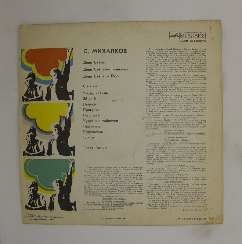 На пластинке звучат такие знакомые и любимые с детства песни, как «Дядя Стёпа», «Дядя Стёпа — милиционер», «Дядя Стёпа и Егор», «Стихи», «36 и 5», «Не спать!», «Чистописание», «Лапуся», «Прогулка», «Чудесные таблетки», «Прививка» и «Подушечка».