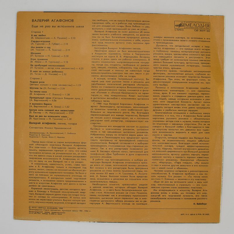 Откройте для себя чарующий мир Валерия Агафонова с его альбомом «Ещё не раз вы вспомните меня…». Погрузитесь в атмосферу ностальгии и романтики, которую несёт в себе каждый трек.