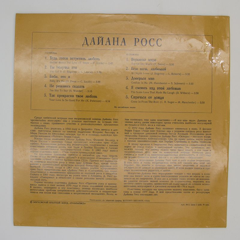 Не упустите возможность создать идеальный вечер с музыкой Дайаны Росс. Погрузитесь в тёплый аналоговый звук виниловой пластинки и насладитесь каждым мгновением. Добавьте этот альбом в свою коллекцию и откройте для себя новые грани музыки!