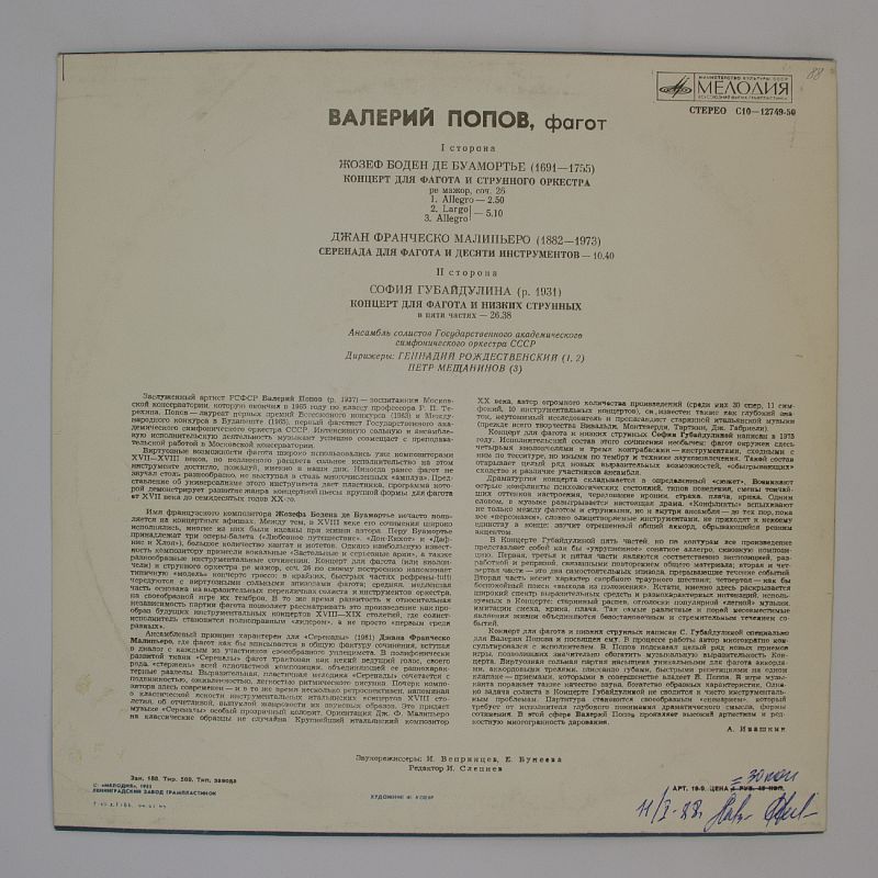Валерий Попов — выдающийся музыкант, который виртуозно исполняет произведения для фагота. В альбоме «Играет Валерий Попов» вы услышите три произведения: Концерт для фагота и струнного оркестра ре мажор, соч. 26; Серенада для фагота и десяти инструментов; Концерт для фагота и низких струнных.