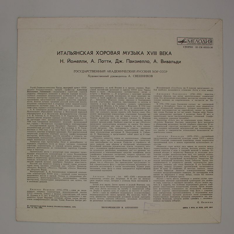 Государственный академический Русский хор СССР представляет вам альбом «Итальянская хоровая музыка XVIII века». Этот уникальный сборник позволит вам окунуться в мир музыки прошлого и прочувствовать его атмосферу.