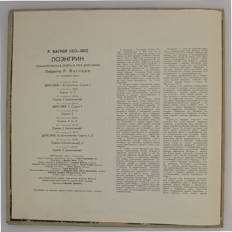 Генрих Птицелов, германский король - Карл Риддербуш, Лоэнгрин - Джеймс Кинг, Эльза, принцесса брабантская - Гундула Яновиц, Фридрих фон Тельрамунд, брабантский граф - Томас Стюарт, Ортруда, его жена - Гвинет Джонс, Герольд - Герд Нинштедт, Четыре брабантских дворянина: Фридрих Ленц, Вилли Брокмайер, Раймунд Грумбах, Рихард Когель; Четыре пажа: солисты хора