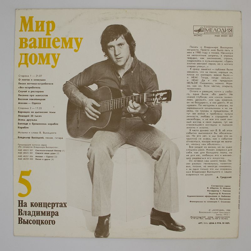 В «Мир Вашему Дому» вы найдёте не только знакомые песни, но и новые грани творчества Высоцкого. Каждая композиция — это история, рассказанная живым и эмоциональным языком. «О Поэтах И Кликушах», «Песня Лётчика-Истребителя», «Случай В Ресторане» — эти и другие треки погружают в атмосферу того времени, когда музыка была не просто развлечением, а способом выразить себя.