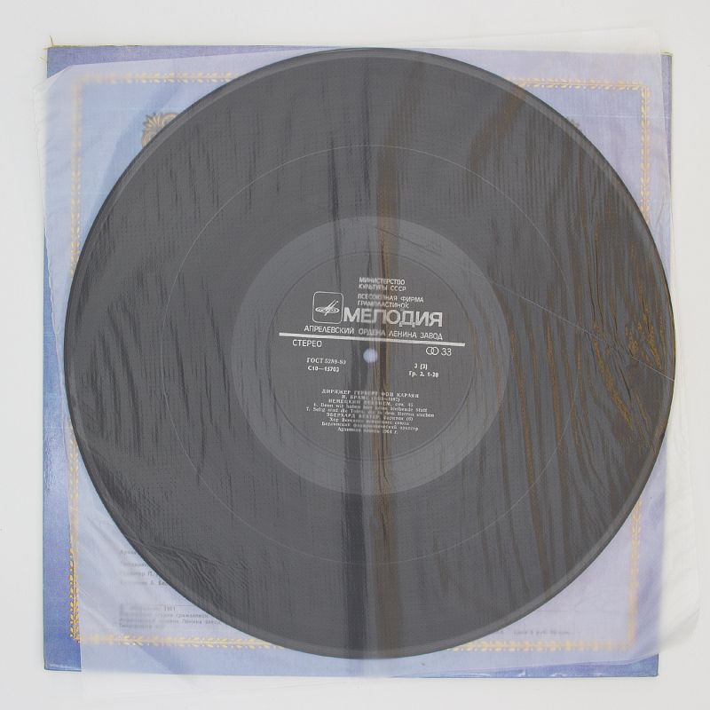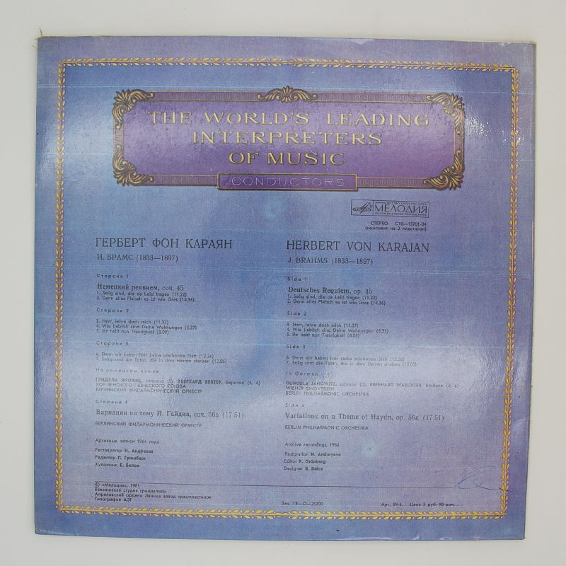 Виниловая пластинка представляет собой запись «Немецкого реквиема» Иоганнеса Брамса в исполнении Берлинского филармонического оркестра под управлением дирижёра Герберта фон Караяна. В дополнение к реквиему на пластинке представлены вариации на тему Й. Гайдна. Произведения исполняются хором и солистами — сопрано Гундулой Яновиц и баритоном Эберхардом Вехтером.