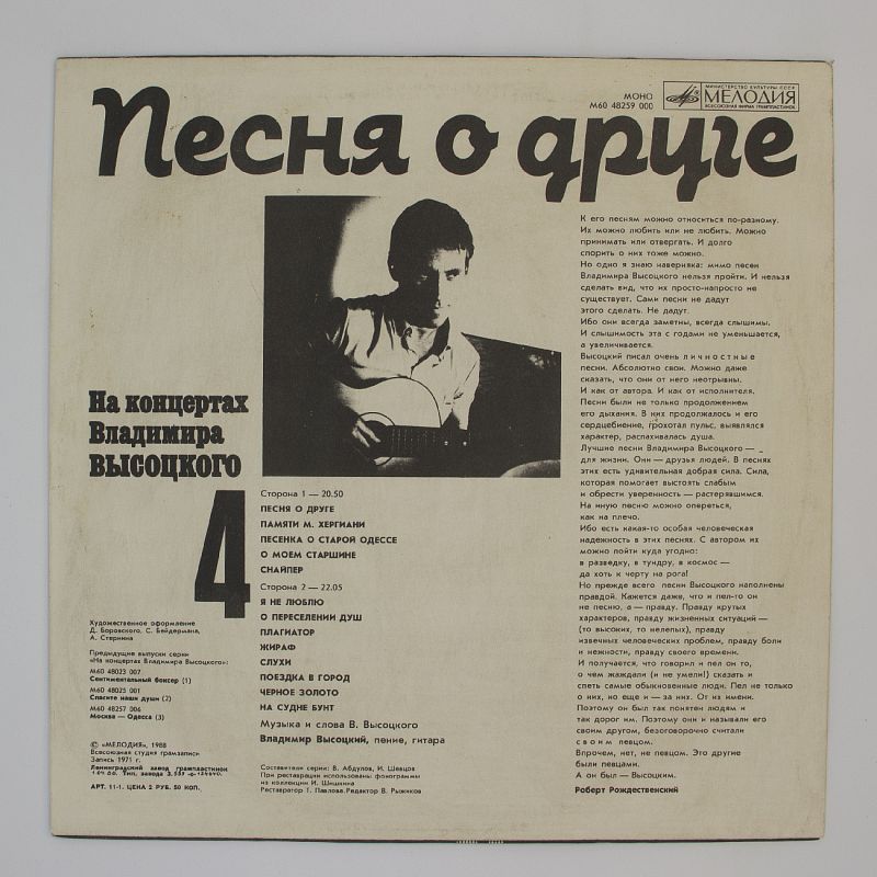 Владимир Высоцкий — один из самых ярких представителей авторской песни. Его творчество отличается глубокой эмоциональностью и искренностью. Альбом «Песня о друге» — это не просто сборник песен, это история, рассказанная голосом одного из самых любимых и значимых артистов.