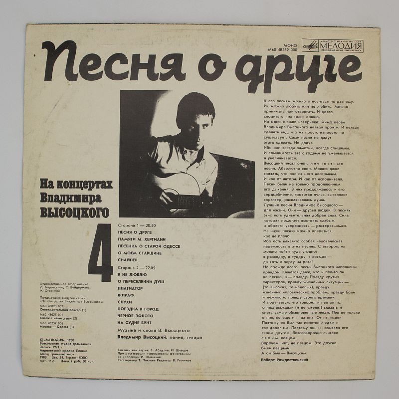 Владимир Высоцкий — один из самых ярких представителей авторской песни. Его творчество отличается глубокой эмоциональностью и искренностью. Альбом «Песня о друге» — это не просто сборник песен, это история, рассказанная голосом одного из самых любимых и значимых артистов.
