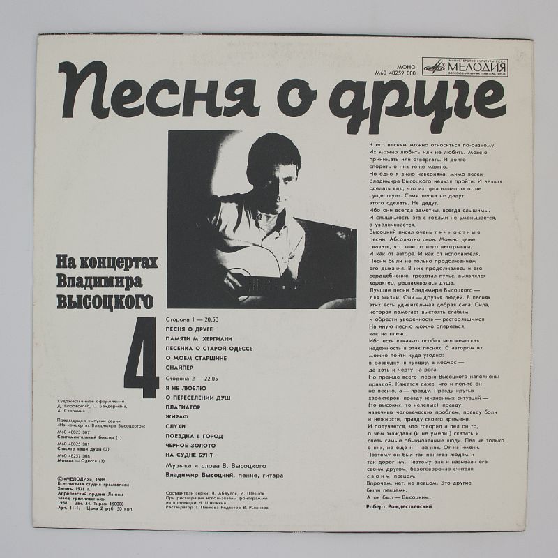 Владимир Высоцкий — один из самых ярких представителей авторской песни. Его творчество отличается глубокой эмоциональностью и искренностью. Альбом «Песня о друге» — это не просто сборник песен, это история, рассказанная голосом одного из самых любимых и значимых артистов.