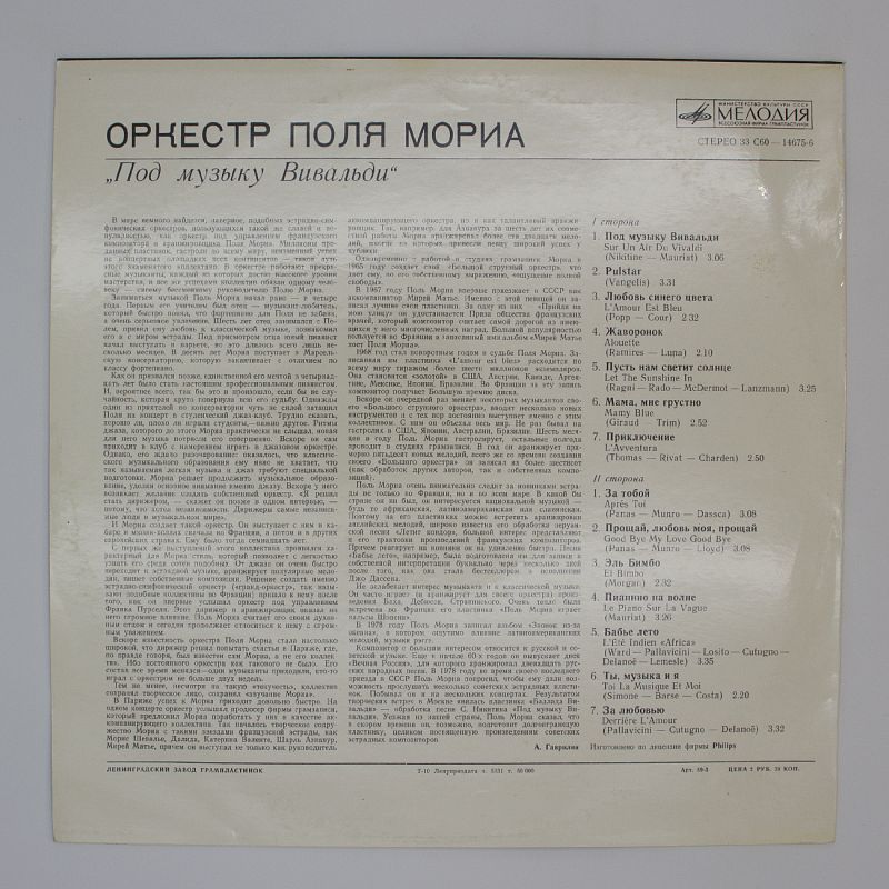 Погрузитесь в чарующий мир классической музыки с оркестром Поля Мориа! «Под Музыку Вивальди» — это не просто альбом, это настоящее путешествие в атмосферу элегантности и гармонии.