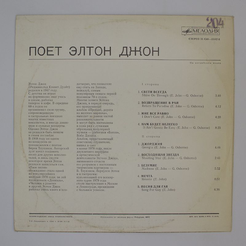 • Состояние пластинки Excellent - хорошее, присутствуют поверхностные потертости, в тихих местах и паузах "песочек"