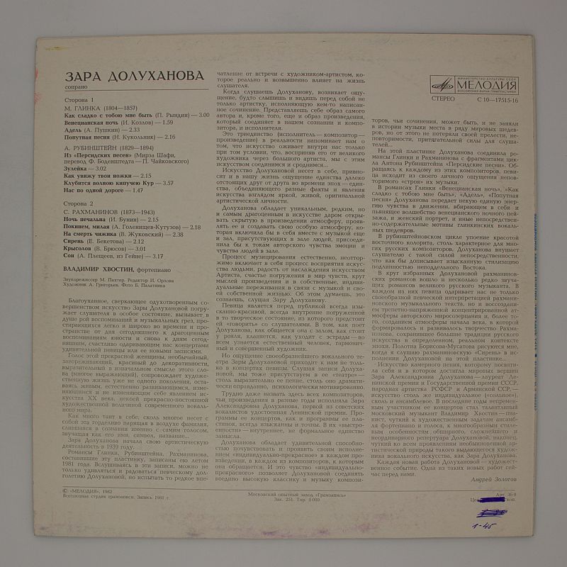 Зара Долуханова — выдающаяся певица, чьё имя стало символом высокого вокального мастерства и проникновенного исполнения. Альбом «Романсы русских композиторов» представляет собой коллекцию произведений, которые позволяют в полной мере оценить талант певицы.
