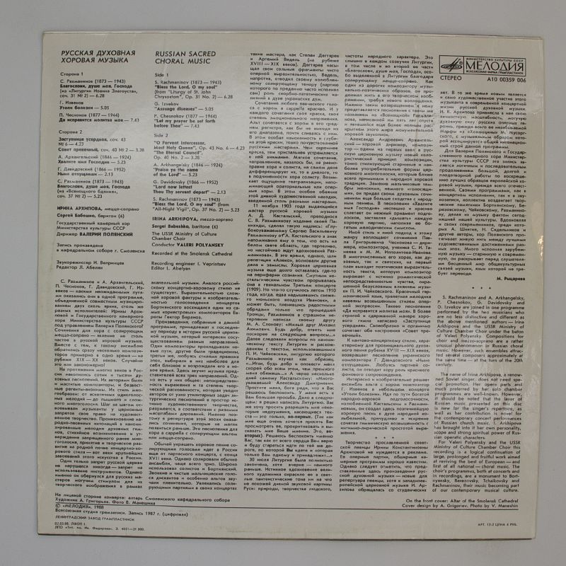 «Русская Духовная Хоровая Музыка» — это альбом, который позволит вам окунуться в атмосферу глубоких и проникновенных произведений. Ирина Архипова, меццо-сопрано, и Сергей Бабешко, баритон, в сопровождении Государственного камерного хора Министерства культуры СССР под управлением дирижёра Валерия Полянского исполняют произведения таких композиторов, как С. Рахманинов, Г. Извеков, П. Чесноков, А. Архангельский и Г. Давидовский.