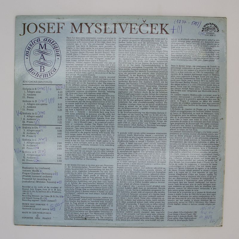 На виниловой пластинке представлены симфонии Йозефа Мысливечека в исполнении Пражского камерного оркестра. В альбоме семь симфоний, каждая из которых состоит из трёх частей: Allegro Assai, Andante и Presto (или Prestissimo в случае симфонии в E). Музыка отличается выразительностью и динамикой, отражая мастерство композитора и профессионализм оркестра.