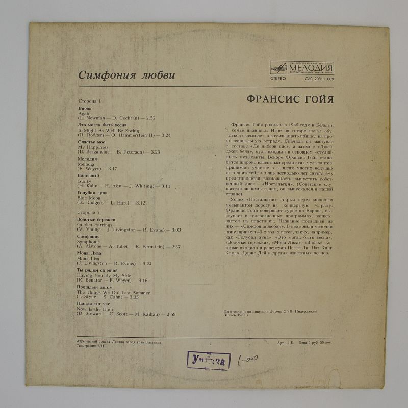 Франсис Гойя — один из самых ярких представителей французской эстрады. Его музыка отличается глубиной и эмоциональностью. Альбом «Симфония Любви» стал настоящим гимном чувств и эмоций.