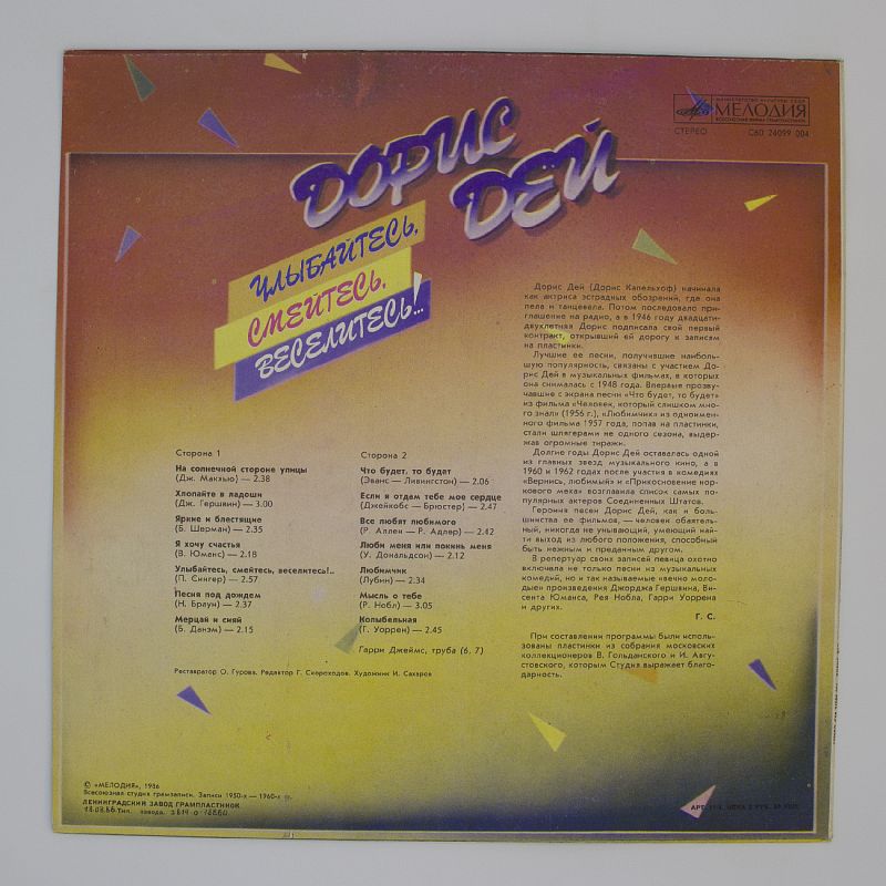 В 60-е годы певица Дорис Дей радовала слушателей яркими мелодиями и позитивным настроением. Альбом «Улыбайтесь, Смейтесь, Веселитесь!..» стал воплощением духа времени, наполненного оптимизмом и энергией.