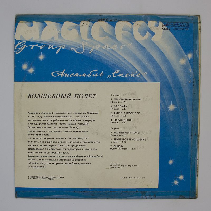 На виниловой пластинке «Space — Волшебный Полёт» представлены композиции в различных музыкальных жанрах. Слушатель окунётся в атмосферу космической баллады, почувствует ритм танго в космосе, испытает наваждение и отправится в волшебный полёт. Также на пластинке есть треки «Вежливое Похищение» и «Синева», которые добавят разнообразие в музыкальный плейлист.